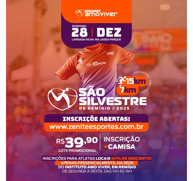 ATLETA LOCAL - Tem direito a 50% de desconto! APENAS inscrições presenciais na sede do Instituto Amo Viver (seg a sexta das 14h às 16h).